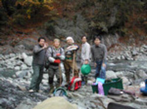 当初は「O山へ登って源流部を見てみよう」という話になっていたのですが、現地に向かう途中の川を覗くと「あれはSさんの車じゃないの?」との声。川に下りてみると先週のポイントでSさんがパンニングをしていました。結局同じ場所で砂金掘りをすることに…