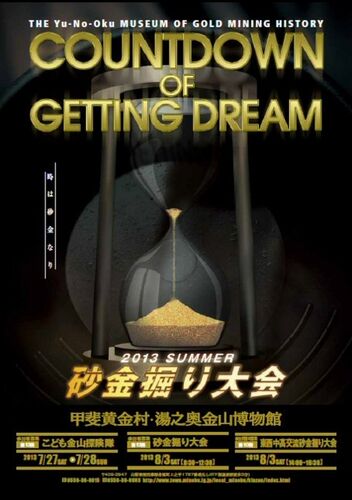 第13回 湯之奥金山博物館杯・砂金掘り大会 ポスターも出来て、受付開始・・・って通年受付らしいんだけど。 http://www.town.minobu.lg.jp/local_minobu/kinzan/summer/summer2.html イベントボランティア(砂金掘り大会では計測係や水替え係)も募集中です(競…