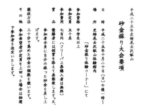 尾去沢鉱山 第22回砂金採り大会 http://www.osarizawa.jp/pdf/2013sakinInfo02.pdf 10月20日午後1時〜 尾去沢鉱山体験館内 砂金採り体験コーナー そういえば、副賞はなんだろう?