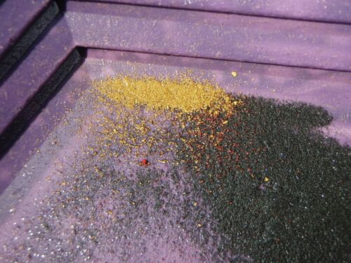 オホーツク海側の浅熱水金銀山地帯で初めての砂金掘り。 期待通りこちらは道央と異なり増水もひどくなく、むしろ砂金掘りに適した水量。 小さな川なので先ずは川中の大きな転石の後ろ側を掘ってみると微細な砂金や辰砂が沢山入っている。、、、粒径は0.1mm程…
