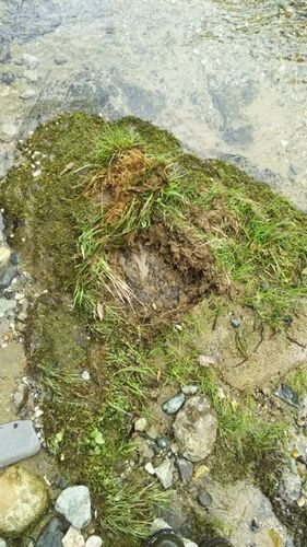 久しぶりに本格的に砂金掘り。 林道を歩いていたら良さそうな盤を見つけたのでメガネ掘り〜 あれ〜最初に2粒ほど3-4mmの期待できそうな粒が出てきて以降は全く採れないな〜では、と 苔をパンニングしてみる。 こちらは細かい金が必ず入ってくるが・・・ うー…