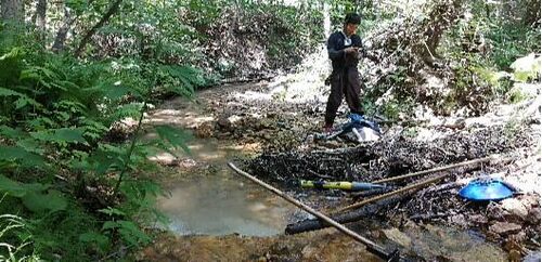 浅熱水の金銀鉱床のある川へ この川は少し下流のブロックの隙間から砂金が採れるのは確認済み。金山に近い上流部分なら砂金の粒が大きく、量も増えると期待して、、、 運の良いことにすぐに盤と落ち込みを発見! ・・・しかし砂金は大きくならず、数も出ず~…