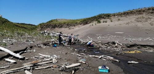 金掘りが大勢殺された伝説が伝わるえりもの浜。数年前にも探したが入口を思い出せず再訪できていなかったのだが、航空写真を見るとどうやら集落に近いところに小河川が2本みられる。ここか? 砂鉄の濃集部分にはたいした数の砂金(粉)は入っていないが、砂利…