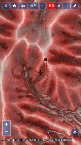赤色立体図で津具金山の遺構らしき場所を探してみる。 テラス状の地形がいくつか見えていて、ここのような気がする。 中央付近の穴のように見えるのはなんだろう? 重要そうなのは上記の遺構らしき付近から北に向かって断続的に溝のような構造が続いていて、…