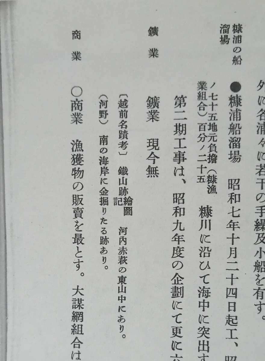 2023-05-17 旧河野村河野の産金 さて、『福井県南條郡誌 全』には金を掘った記述もあって、旧河野村河野地区で (河野)南の海岸に金掘りたる跡あり。 跡あり、ということは浜砂金じゃなくて坑道掘りなのか?それとも? ここは敦賀の浜砂金産地の北側にあたるので、敦賀の浜砂金を見つけた人はこれをヒントにしたのだろうか? とはいえ現在の河野地区は浜の発達が悪いので、試すなら海水浴場付近で、ということになるのだが・・・