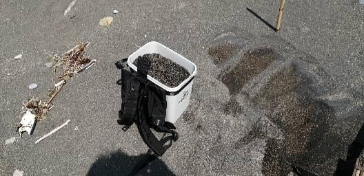 2024-06-10 本日の土砂供給量 浜でせっせと土砂(ほとんど砂鉄)運び~ 掘る場所とスルースボックスの設置場所の間の距離は30mくらいか? 運搬回数7~8回/h、土砂重量20kg/回、作業時間8hとして・・・1.1~1.3t/日といったところだろうか?
