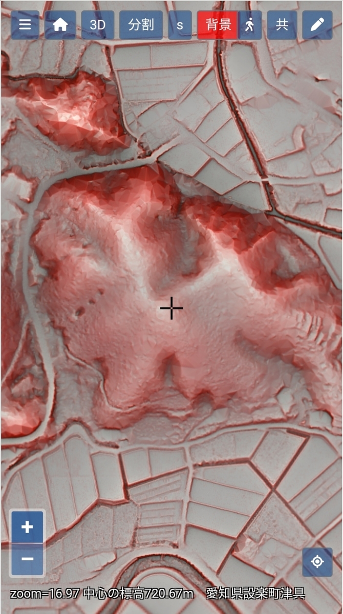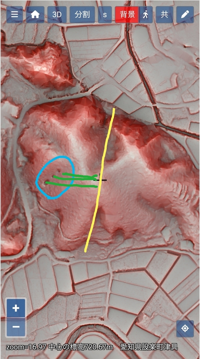 中央の十字の上下(南北)の谷は採掘跡の可能性があるのでは?